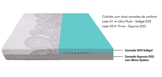 O tecido superior, feito em malha de toque macio, realça a beleza e o conforto do colchão, enquanto a lateral em Plus Cinza adiciona um visual elegante e moderno. Com pillow top duplo, o colchão atinge 25 cm de altura, oferecendo nível de conforto Ultra Plush e resistência excepcional.