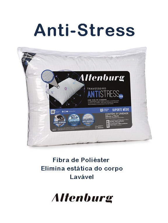 O Travesseiro Antistress possui fios de carbono na estrutura do tecido que agem na condução da energia eletrostática do corpo, acumulada durante o dia, principalmente, na região da cabeça, pescoço e ombros; uma das causas da insônia. O princípio antiestático do fio de carbono conduz a energia eletrostática do tecido ao ar, neutralizando a energia conduzida ao travesseiro. Com suporte médio, indicado para quem dorme de lado, garante uma qualidade de sono restauradora e relaxante.