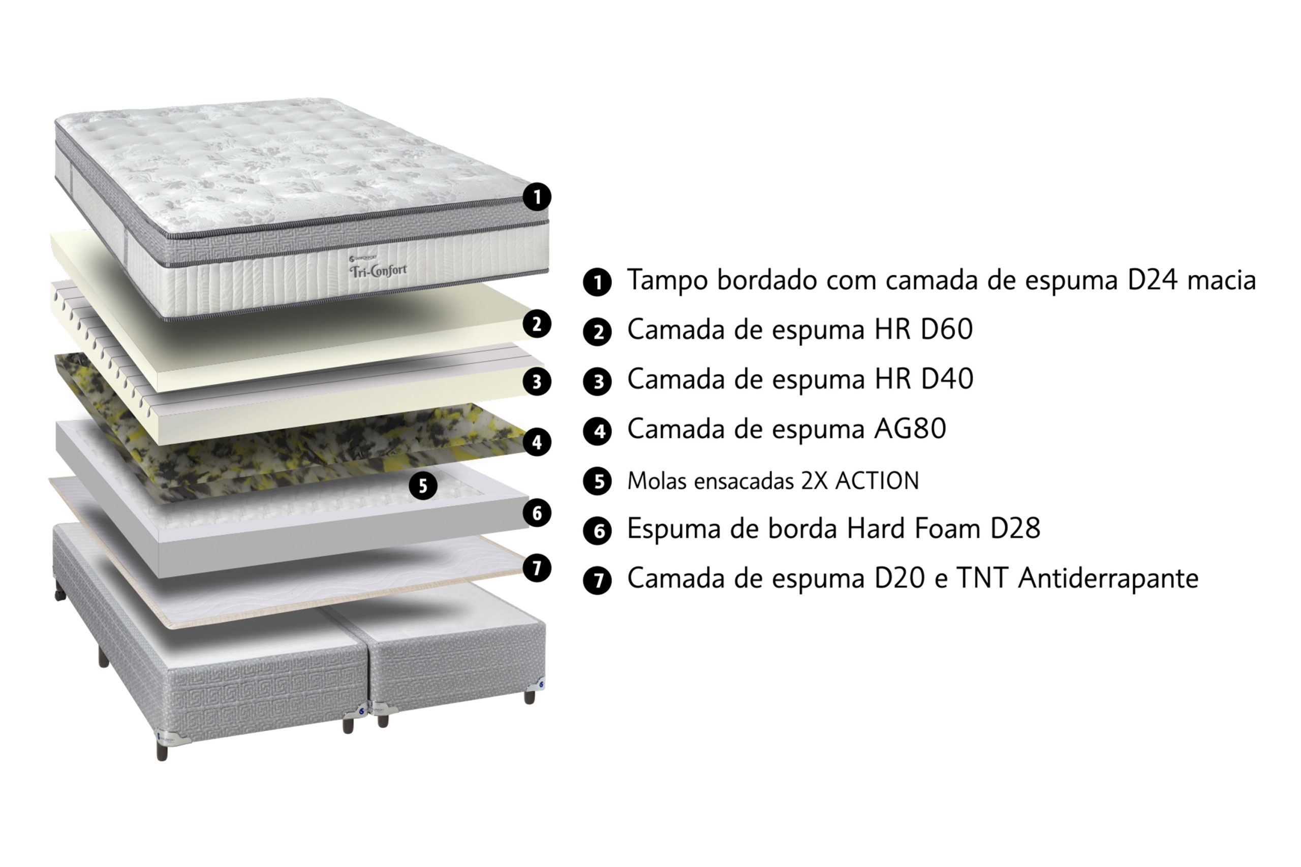 MOLAS 2X Action – As molas são ensacadas uma a uma, trabalham como suspensão independente, uma se move e as outras ficam na mesma posição. Ombro e quadril provocam variação de molas e outras sustentam o corpo com perfeita anatomia. Hard Foam espuma de alta densidade que garante maior durabilidade e firmeza nas laterais do colchão.